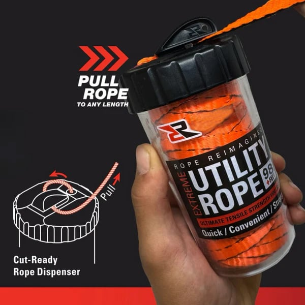 - MULTIPURPOSE AND REUSABLE: For indoor and outdoor use. Rope is perfect for camping supplies, backpacking gear, emergency kits, tie down rope, the possibilities are endless! The canister is reusable. When you run out of rope, just add a Rope refill, and you’re good-to-go.